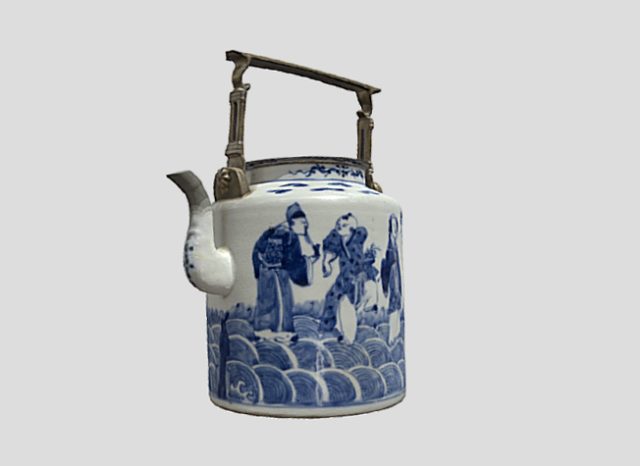 ลักษณะ: หูหิ้วทำจากทองเหลือง ลักษณะเป็นทรงกลม ปากบาน ก้นตัด เขียนลายเครือเถาที่ขอบ ส่วนตรงกลาง เป็นลายเมฆ ถัดลงมาเป็นลาย “โป๊ยเซียน” เป็นนามเรียกของเทพทั้ง แปดที่ชาวจีนนับถือ มาจากภาษาจีนสำเนียงแต้จิ๋ว พวยกาเขียนลายช่อดอกไม้ ภายใน เคลือบขาว ไม่มีลาย ก้นมีตัวอักษรภาษาจีน โดยชาวจีนเชื่อกันว่าแปดเซียนเป็น สัญลักษณ์ของความสุข ความโชคดีและการอำนวยพรให้มีอายุยืนยาว
