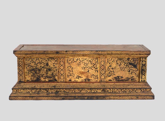 หีบพระธรรม 24/ก.ย./2017 2165 views สมัยพุทธศตวรรษที่ 24 เป็นศิลปะรายรดน้ำ ลงรักปิดทอง ลายราชสีห์ สิงโตจีน และสิงห์ ล้อมด้วยลายดอกพุด