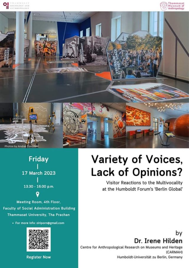 วันศุกร์ที่ 17 มีนาคม 2566 | เวลา 13.30-16.00 น.#พิพิธภัณฑ์ธรรมศาสตร์เฉลิมพระเกียรติ#คณะสังคมวิทยาและมานุษยวิทยา มหาวิทยาลัยธรรมศาสตร์ขอเชิญร่วมฟังการบรรยาย และแลกเปลี่ยนประสบการณ์เกี่ยวกับการจัดแสดงนิทรรศการในพิพิธภัณฑ์ และการวิจัยผู้เข้าชม (Visitor Research) หัวข้อ ”Variety of Voices, Lack of Opinions? Visitor Reactions to the Multivocality at the Humboldt Forum’s ‘Berlin Global’”โดย Dr. Irene HildenCentre for Anthropological Research on Museums and Heritage (CARMAH)Humboldt-Universität zu Berlin, Germany ณ ห้องประชุม ชั้น 4 ตึกคณะสังคมสงเคราะห์ศาสตร์ มหาวิทยาลัยธรรมศาสตร์ ท่าพระจันทร์ [บรรยายเป็นภาษาอังกฤษ โดยมีล่ามแปลเป็นภาษาไทย]ท่านที่สนใจสามารถลงทะเบียนออนไลน์ผ่าน Link ข้างล่างนี้ หรือ QR code ในโปสเตอร์: https://docs.google.com/…/1FAIpQLSdHtJ6sXvb…/viewform…สอบถามรายละเอียดเพิ่มเติม: Email: ziriporn@gmail.com FB ib: https://www.facebook.com/SocAnthTUMuseum. . . . . . . . . . . . . . . . . . . . . . . . . . . . . . . . . . . . .Friday 17 March 2023 (13.30 – 16.00 p.m.) Thammasat Museum of Anthropology, Faculty of Sociology and Anthropology invites you to join a museum talk entitled: ”Variety of Voices, Lack of Opinions? Visitor Reactions to the Multivocality at the Humboldt Forum’s ‘Berlin Global’”By Dr. Irene HildenCentre for Anthropological Research on Museums and Heritage (CARMAH)Humboldt-Universität zu Berlin, Germany “This talk will provide insights into the research project ‘Realizations and Reception in the Humboldt Forum Berlin,’ based at the Centre for Anthropological Research on Museums and Heritage (CARMAH), Humboldt-Universität zu Berlin, Germany. With ethnographic audience research at its root, the project explored how visitors engaged with the newly opened cultural space of the Humboldt Forum and its exhibitions during the first weeks of the institution’s operation. The talk will focus on some of the findings related to audience experiences of multivocality as employed in the exhibition ‘Berlin Global.’” Venue: Meeting Room, 4th Floor Faculty of Social Administration Building Thammasat University, Tha Prachan, BangkokOnline Registration at: https://docs.google.com/…/1FAIpQLSdHtJ6sXvb…/viewform…For more info, please contact: Email: ziriporn@gmail.com