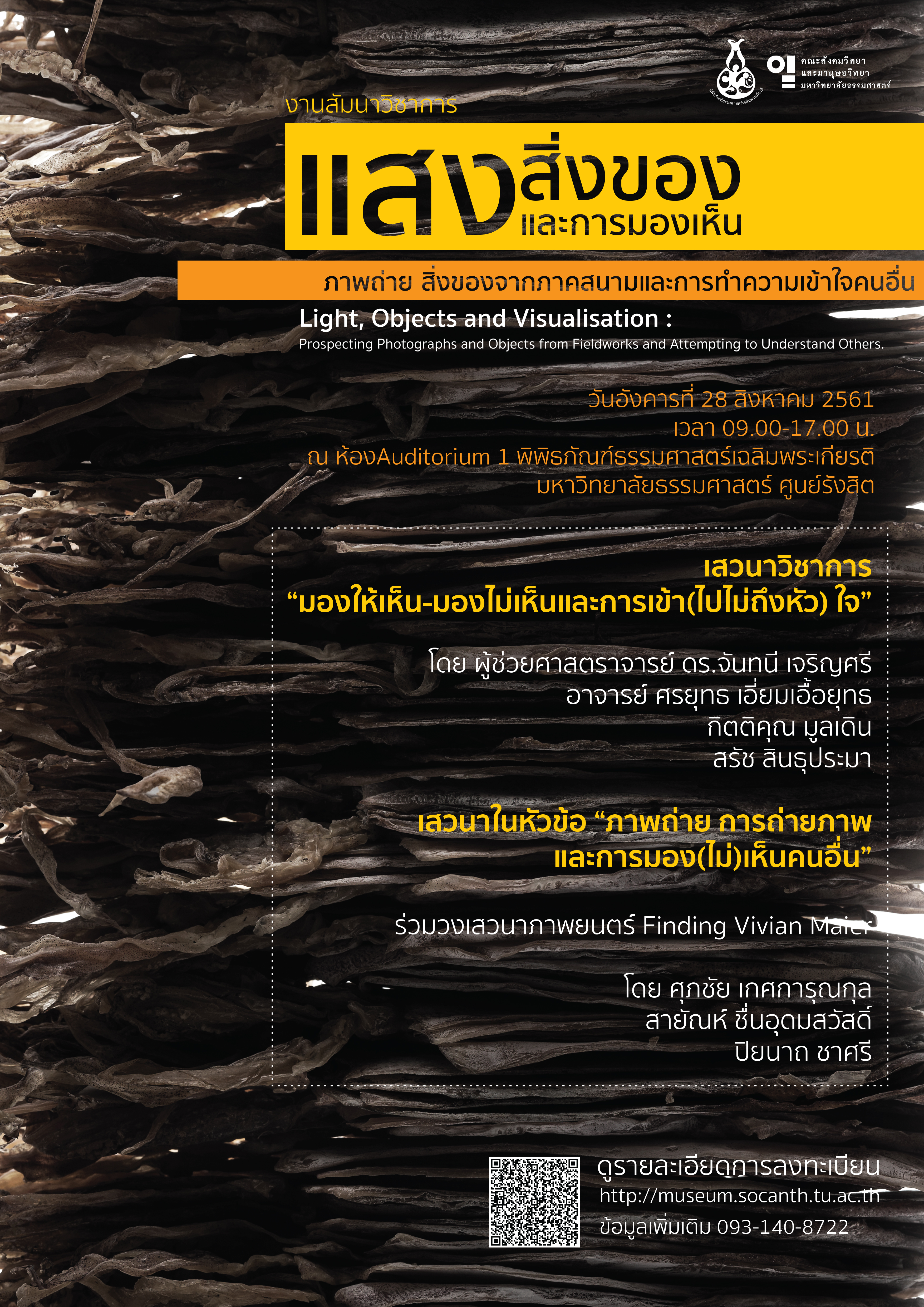เสวนาวิชาการ “มองให้เห็น-มองไม่เห็นและการเข้า(ไปไม่ถึงหัว) ใจ” ผู้ร่วมสัมมนา ผู้ช่วยศาสตราจารย์ ดร.จันทนี เจริญศรี อาจารย์ประจำคณะสังคมวิทยาและมานุษยวิทยา มหาวิทยาลัยธรรมศาสตร์ อาจารย์ ศรยุทธ เอี่ยมเอื้อยุทธ อาจารย์ประจำภาควิชาสื่อศิลปะและการออกแบบสื่อ คณะวิจิตรศิลป์ มหาวิทยาลัยเชียงใหม่ (นักศึกษาปริญญาเอกด้านมานุษยวิทยาว่าด้วยสื่อและ การทัศนา (Visual and Media Anthropology)มหาวิทยาลัยเสรีแห่งกรุงเบอร์ลิน กิตติคุณ มูลเดิน ศิษย์เก่าคณะสังคมวิทยาและมานุษยวิทยา ดำเนินรายการโดย สรัช สินธุประมา นักศึกษาปริญญาโท สาขามานุษยวิทยา คณะสังคมวิทยาและมานุษยวิทยา มหาวิทยาลัยธรรมศาสตร์ |