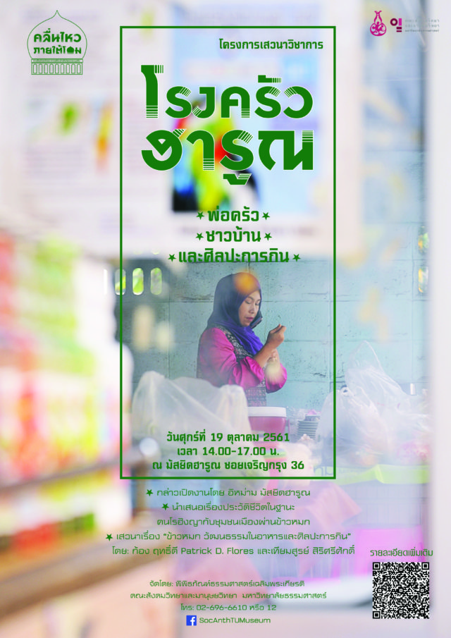 ขอเชิญผู้สนใจเข้าร่วมฟังเสวนาวิชาการในหัวข้อ“โรงครัวฮารูณ:พ่อครัว ชาวบ้านและศิลปะการกิน”ภายใต้โครงการ “คลื่นไหว ภายใต้โดม:การเป็นส่วนหนึ่งและการเครลื่อนย้ายในวัฒนธรรมมุสลิม”