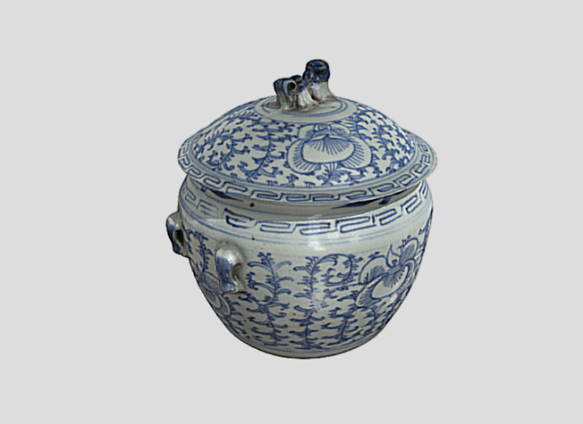 ลักษณะ: โถลายครามพร้อมฝา ส่วนปากและลำตัวของโถมีสีพื้นเป็นสีขาวและเขียนลายสีน้ำเงินใต้ เคลือบ ฝาและลำตัวโถตกแต่งด้วยลายดอกโบตั๋นและลายก้านขด ลำตัวมีหู 4 หู ฝาจุกเป็นรูปสิงโตเคลือบสีน้ำเงิน โถลายครามเป็นที่นิยมในกลุ่มคนซึ่งอยู่อาศัยในแถบประเทศสิงคโปร์ และอินโดนีเซีย เป็นกลุ่มลูกครึ่งจีนกับมลายูที่มีวัฒนธรรมผสมผสานและสร้างวัฒนธรรมแบบใหม่เรียกว่า “เปอรานากัน” แปลว่า “เกิดที่นี่” ส่วนในภูเก็ตเรียกคนที่มีเชื้อสายจีนผสมกับคนพื้นเมืองว่า “บาบ๋า”