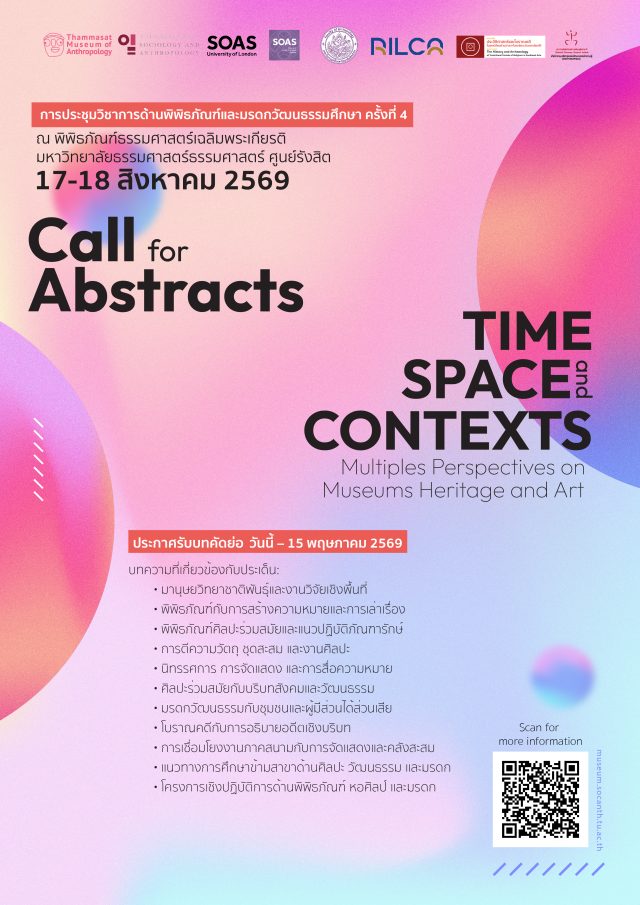 บทคัดย่อภาษาไทย ในรูปแบบ MsWord ความยาวไม่เกิน 300 คำ (ประมาณ 1 หน้ากระดาษ A4) พร้อมระบุ ชื่อบทความภาษาไทย ชื่อบทความภาษาอังกฤษ ชื่อผู้เขียน ต้นสังกัด ที่อยู่ เบอร์โทรศัพท์ E-mail มาที่ museum.socanth@gmail.com ภายในวันที่ 15 พฤษภาคม 2569
