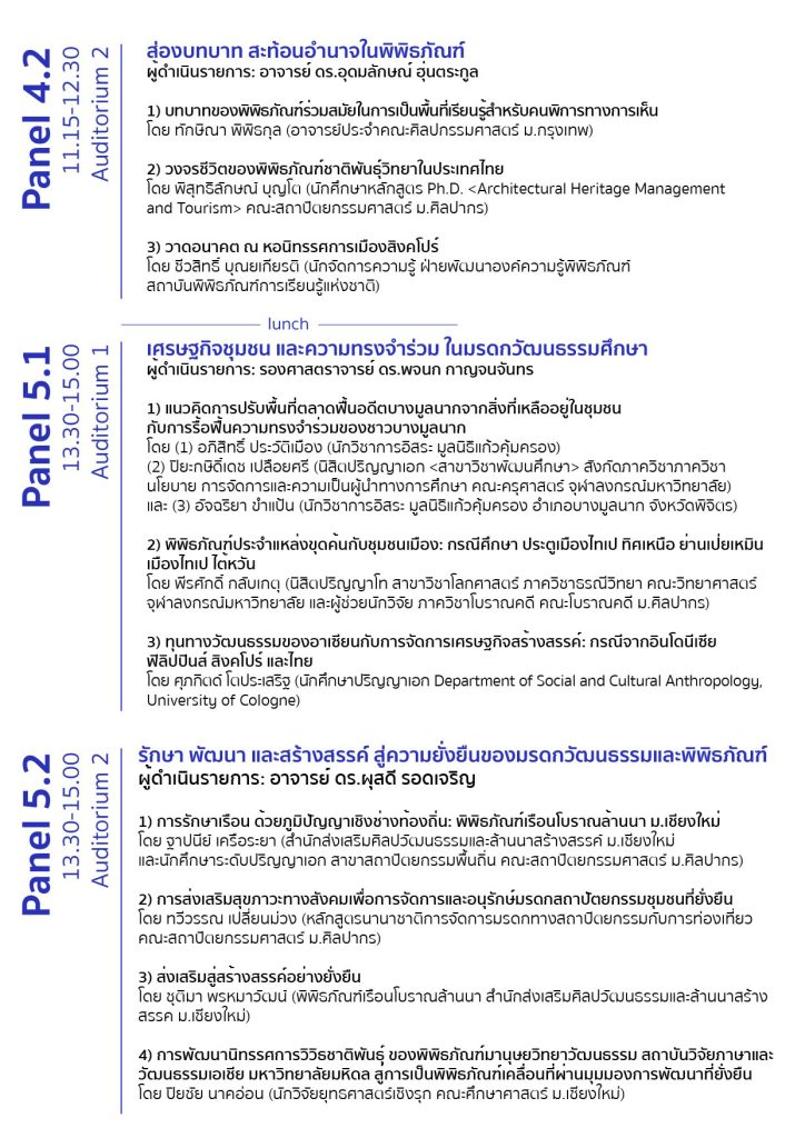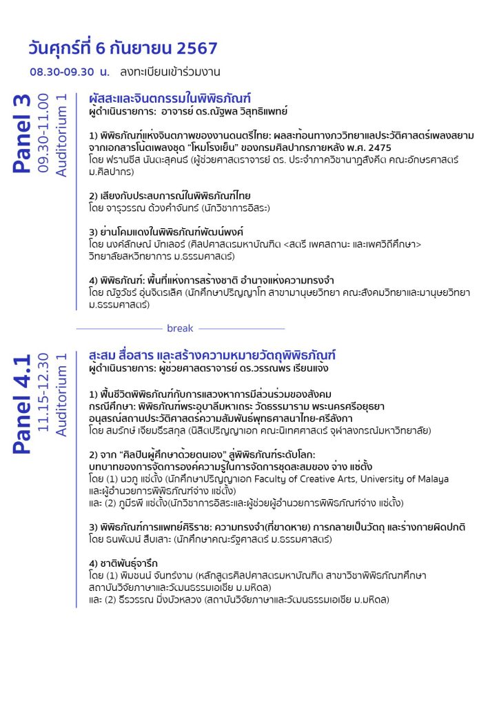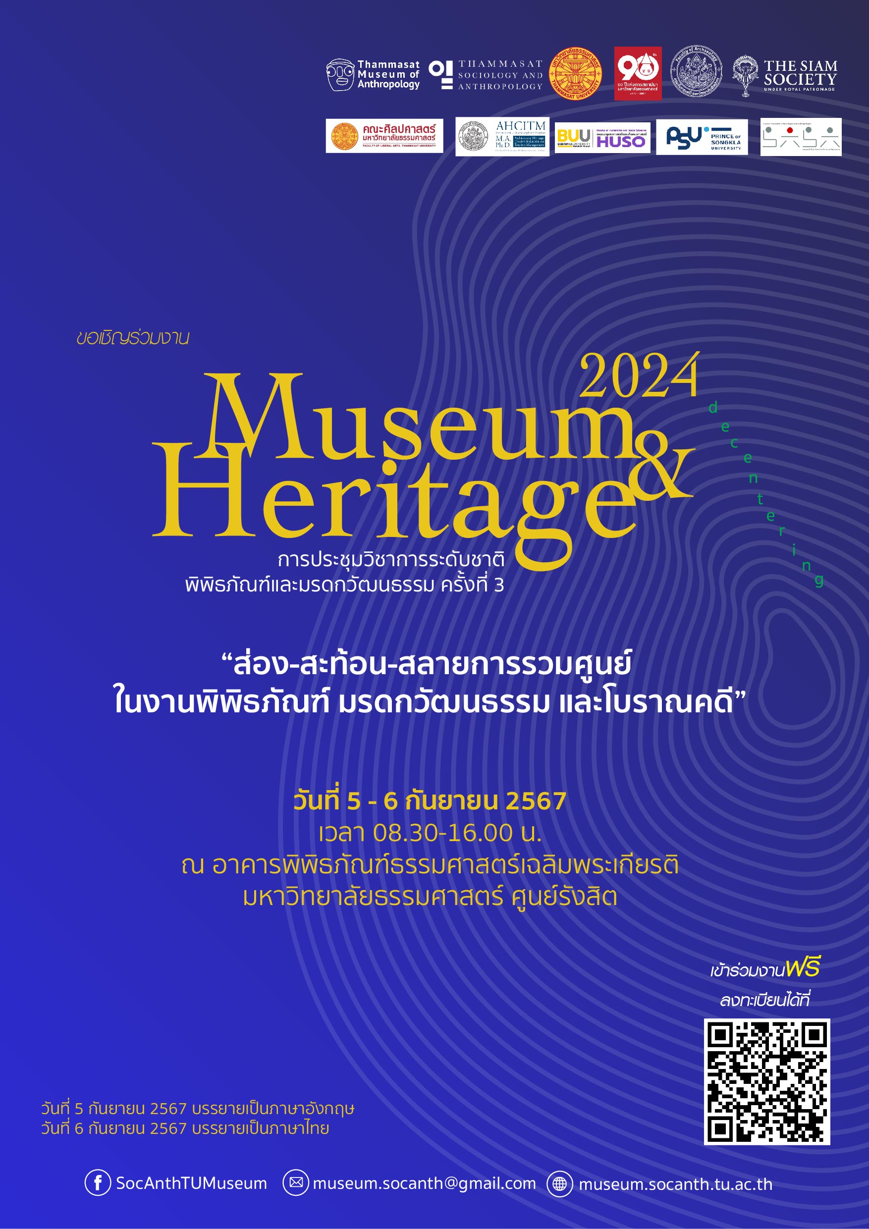 การประชุมวิชาการระดับชาติ พิพิธภัณฑ์และมรดกวัฒนธรรม ครั้งที่ 3 14/ส.ค./2024 363 views พิพิธภัณฑ์ธรรมศาสตร์เฉลิมพระเกียรติ คณะสังคมวิทยาและมานุษยวิทยา มหาวิทยาลัยธรรมศาสตร์ ร่วมกับ มหาวิทยาลัยสงขลานครินทร์ คณะศิลปศาสตร์ มหาวิทยาลัยธรรมศาสตร์ คณะมนุษยศาสตร์และสังคมศาสตร์ มหาวิทยาลัยบูรพา หลักสูตรนานาชาติการจัดการมรดกทางสถาปัตยกรรมกับการท่องเที่ยว คณะสถาปัตยกรรมศาสตร์ มหาวิทยาลัยศิลปากร คณะโบราณคดี มหาวิทยาลัยศิลปากร สยามสมาคมในพระบรมราชูปถัมภ์ และสมาคมนักสังคมวิทยาและนักมานุษยวิทยาสยาม (สสมส.) ขอเชิญผู้ที่สนใจเข้าร่วมฟังการประชุมวิชาการระดับชาติ พิพิธภัณฑ์และมรดกวัฒนธรรม ครั้งที่ 3 “ส่อง-สะท้อน-สลายการรวมศูนย์ ในงานพิพิธภัณฑ์ มรดกวัฒนธรรม และโบราณคดี” วันพฤหัสบดีที่ 5 และวันศุกร์ที่ 6 กันยายน 2567 วันที่ 5 กันยายน 2567 บรรยายเป็นภาษาอังกฤษ วันที่ 6 กันยายน 2567 บรรยายเป็นภาษาไทย ณ อาคารพิพิธภัณฑ์ธรรมศาสตร์เฉลิมพระเกียรติ มหาวิทยาลัยธรรมศาสตร์ ศูนย์รังสิต ผู้สนใจสามารถลงทะเบียนออนไลน์ได้ที่ https://forms.gle/HJDdG2cWbQMJWQ2Q6 **ขอสงวนสิทธิ์อาหารกลางวันและอาหารว่าง สำหรับผู้ลงทะเบียนเท่านั้น**