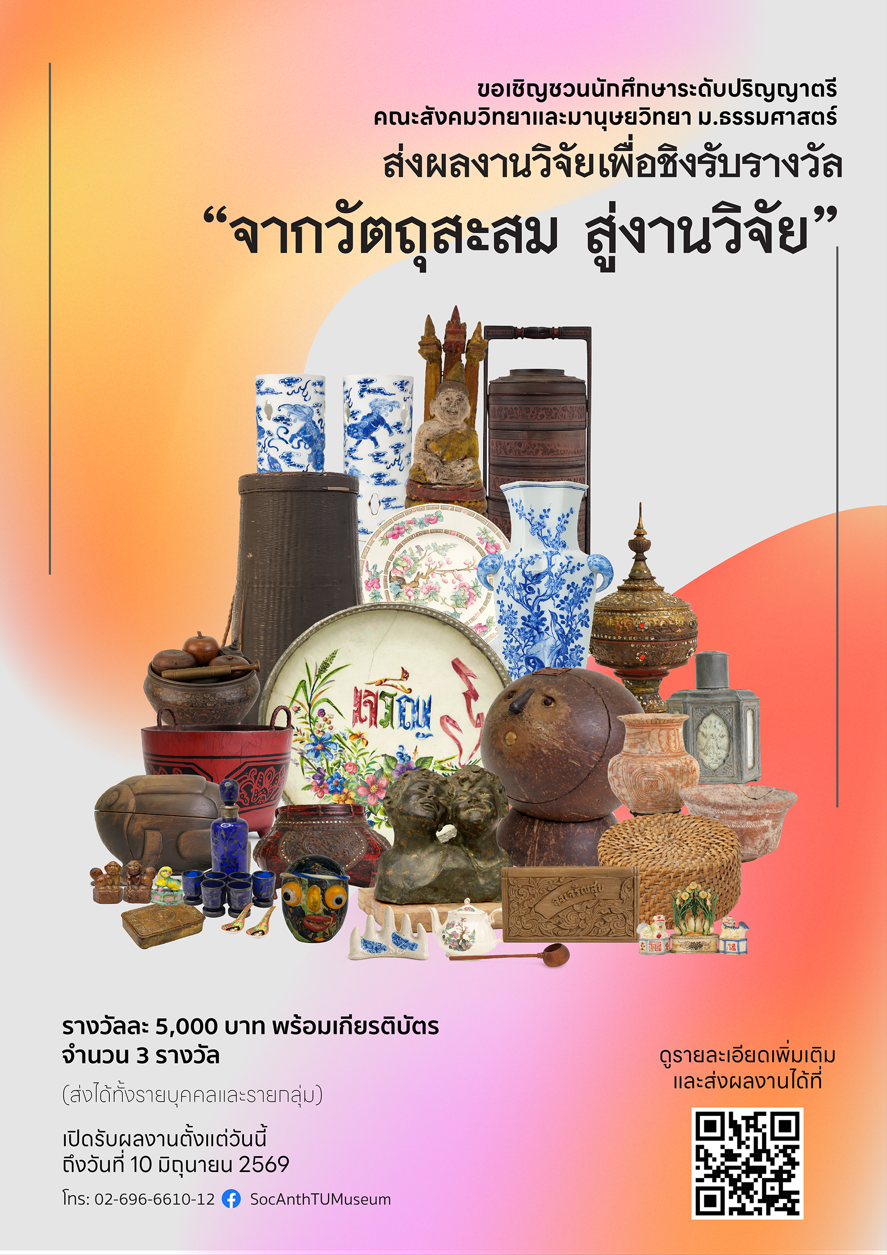 พิพิธภัณฑ์ธรรมศาสตร์เฉลิมพระเกียรติ เชิญชวนนักศึกษาระดับปริญญาตรี คณะสังคมวิทยาและมานุษยวิทยา มหาวิทยาลัยธรรมศาสตร์ ร่วมส่งผลงานวิจัย ที่มาจากการศึกษาวัตถุสะสมของพิพิธภัณฑ์ฯ เข้าชิงรางวัล 5,000 บาทพร้อมเกียรติบัตร จำนวนรางวัล 3 รางวัล ส่งผลงานได้ตั้งแต่วันนี้-ถึง 10 มิถุนายน 2569